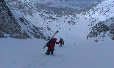 Pinta mal temps, i ho comprovem de veritat. Estem dormint a l’aparcament de l’estació d’esquí de Mijanes, per anar a fer el Tarbesou, ja que està tot carregat de neu, però passem una nit de vent i neu, al mati segueix el mateix panorama i decidim marxar cap a la Cerdanya. Anem a St Pere dels Forcats i començem a pujar per pistes a les 11 amb l’intenció d’arribar a sota del circ de Cambra d’ase, anem pujant i la neu està prou estable, aixi que enfilem per la Canal Central primer amb esquis i desprès a peu, sortim de la canal i nomes ens queda una cresteta fins el cim.La baixada la fem per el mateix itinerari, amb una neu molt bona a la part alta de la canal, una mica crosta al mig i pols de la meitat de canal avall i a la part del bosc es rasquen les pedres.